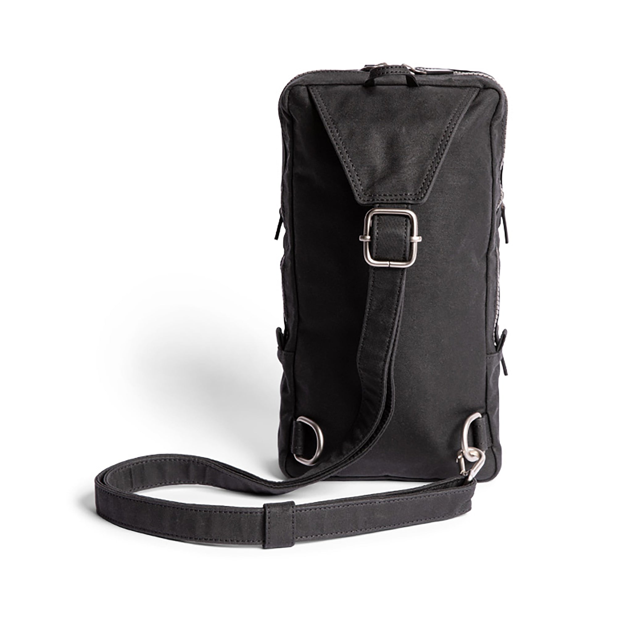 The Colby Sling is a weatherproof sling bag made with 100% organic cotton canvas and coated with a biodegradable, water-resistant wax. Features a main compartment with an interior slip pocket and three exterior zipper pockets for easy access to essentials. The canvas shoulder strap is adjustable with solid brass hardware.