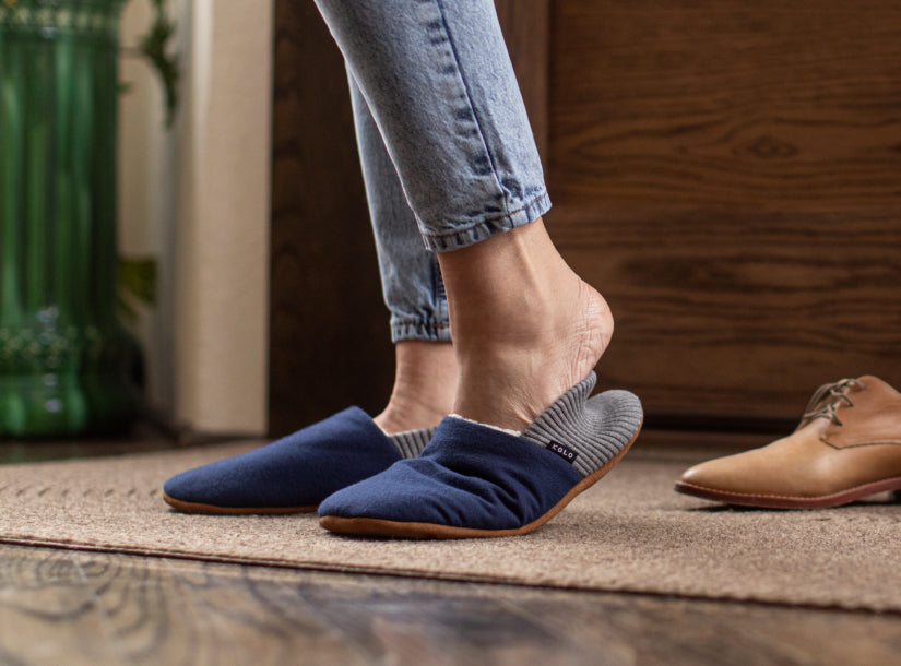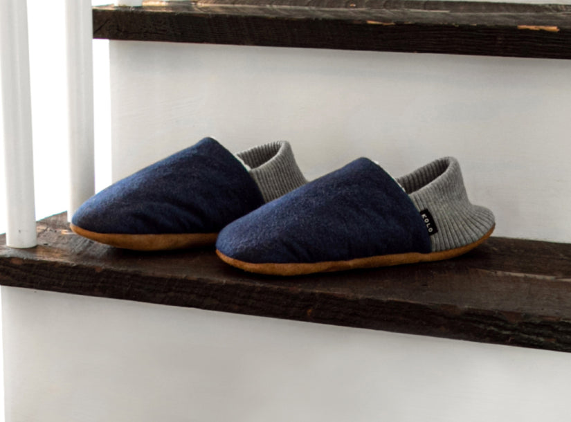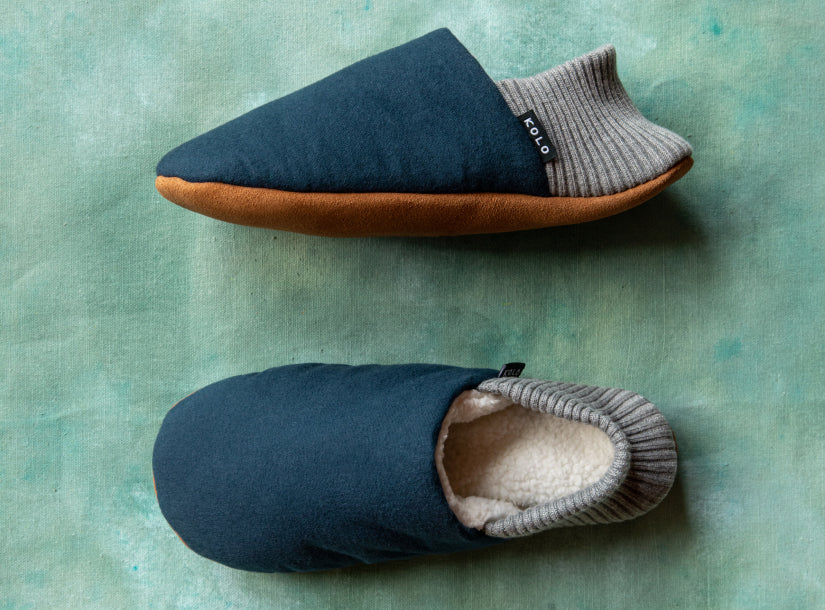 House Shoes in cotton chamois milled in Portugal, lined with ultra-soft fleece, supported by an elastic cotton mixed heel and suede leather bottom for grip.