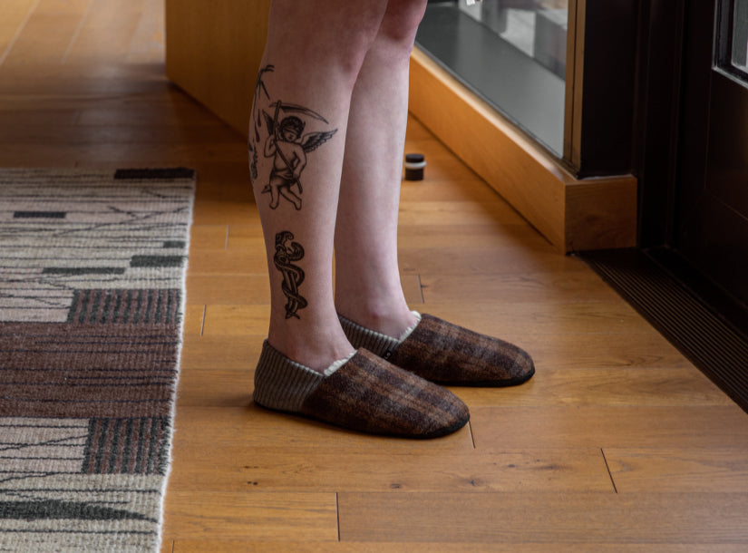 Heritage Scottish wool tweed exterior. Soft faux-fur lining ensuring your feet stay warm and comfortable throughout the day. Italian suede soles offer a perfect balance of durability and grip.